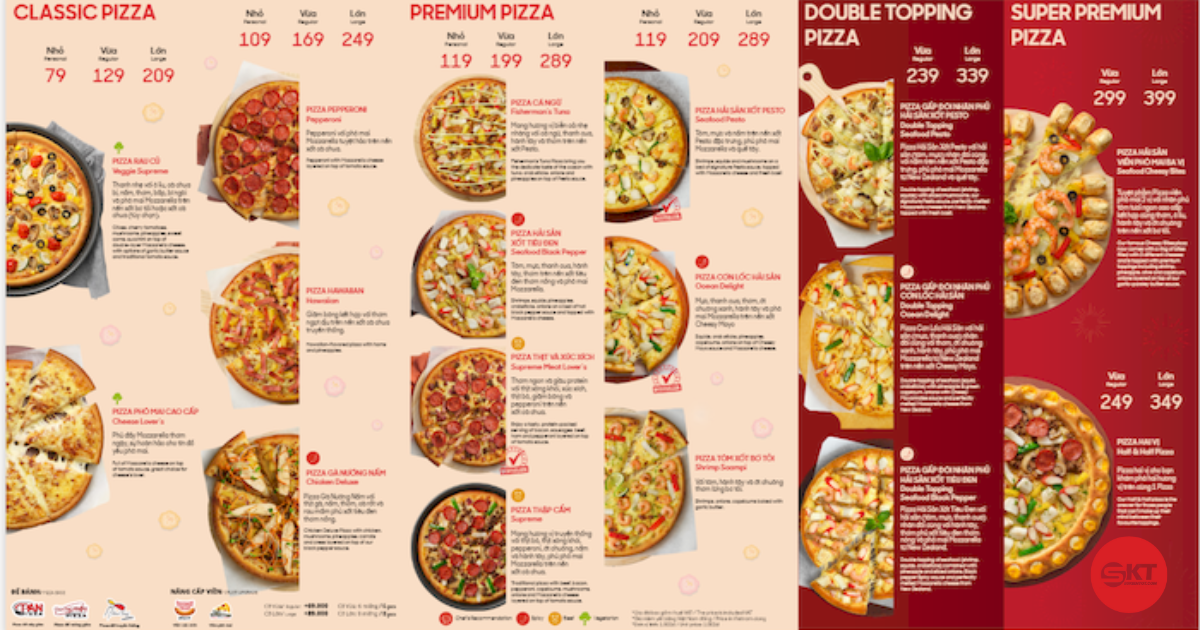 Thực đơn pizza quen thuộc, dễ lựa chọn cho nhóm đông.