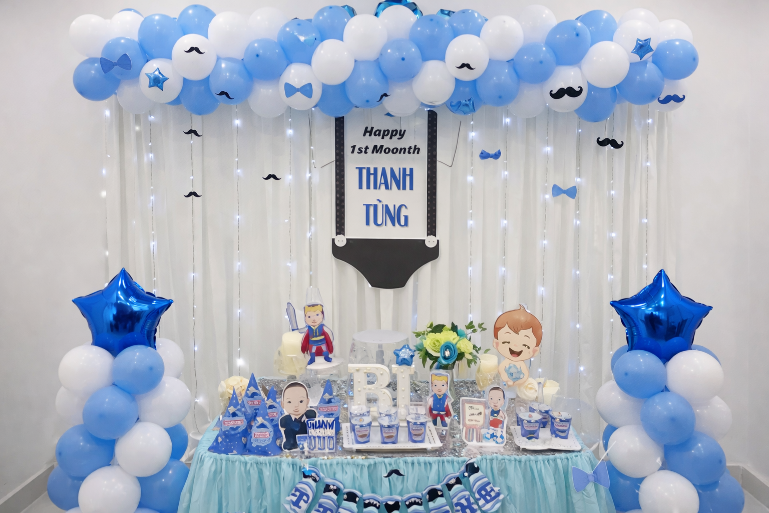 Ngoài ra, khách hàng có thể lựa chọn nâng cấp thêm các hạng mục như cổng bóng lớn, bóng trần, đèn led trang trí, hoa tươi hoặc phụ kiện chụp ảnh để tăng hiệu ứng không gian. Với những gia đình muốn buổi tiệc sôi động hơn, có thể kết hợp thêm các dịch vụ hỗ trợ như chú hề hoạt náo, ảo thuật gia hoặc MC mini cho tiệc tại nhà.
