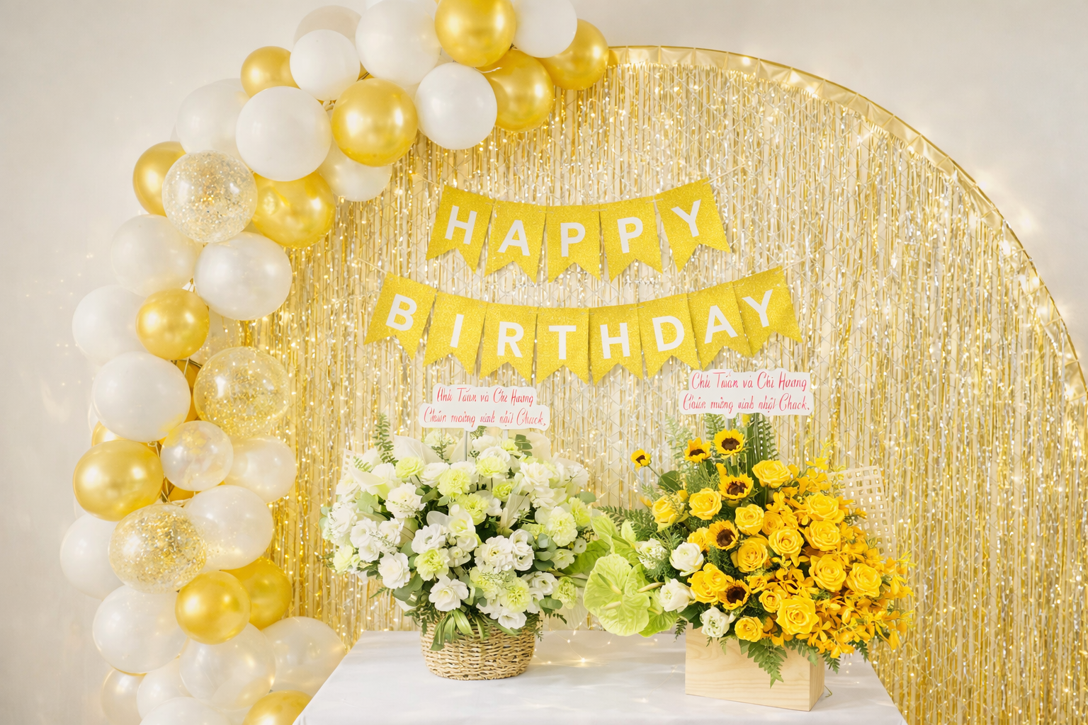 Với tiệc sinh nhật người lớn hoặc tiệc kỷ niệm, phong cách trang trí tối giản nhưng sang trọng được lựa chọn nhiều hơn. Backdrop trơn, chữ mica hoặc decal tinh tế, bóng bay được tiết chế về số lượng nhưng chọn màu sắc cao cấp như trắng – kem – gold hoặc đen – gold giúp không gian trở nên lịch sự và hiện đại.
