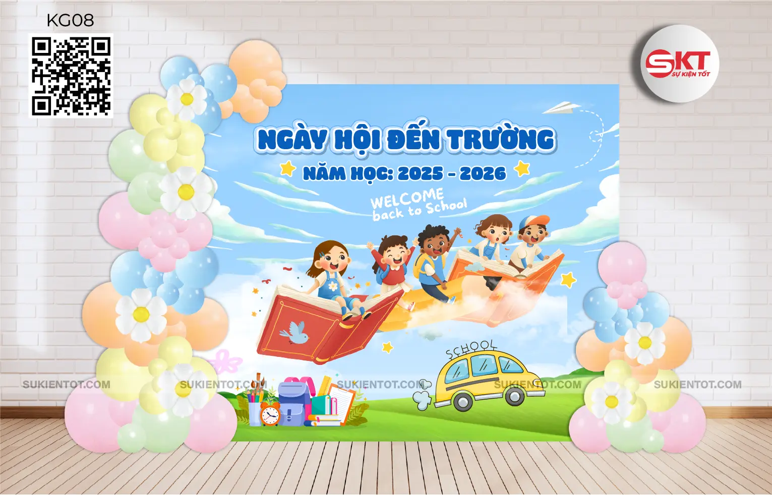 Thiết kế sinh động với hình ảnh các bé trên hành trình đến trường, tạo cảm giác vui nhộn và đầy hứng khởi. Phù hợp cho không gian rộng hoặc tổ chức ngoài trời.